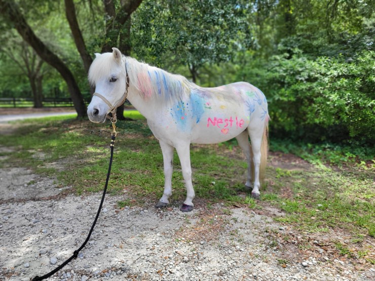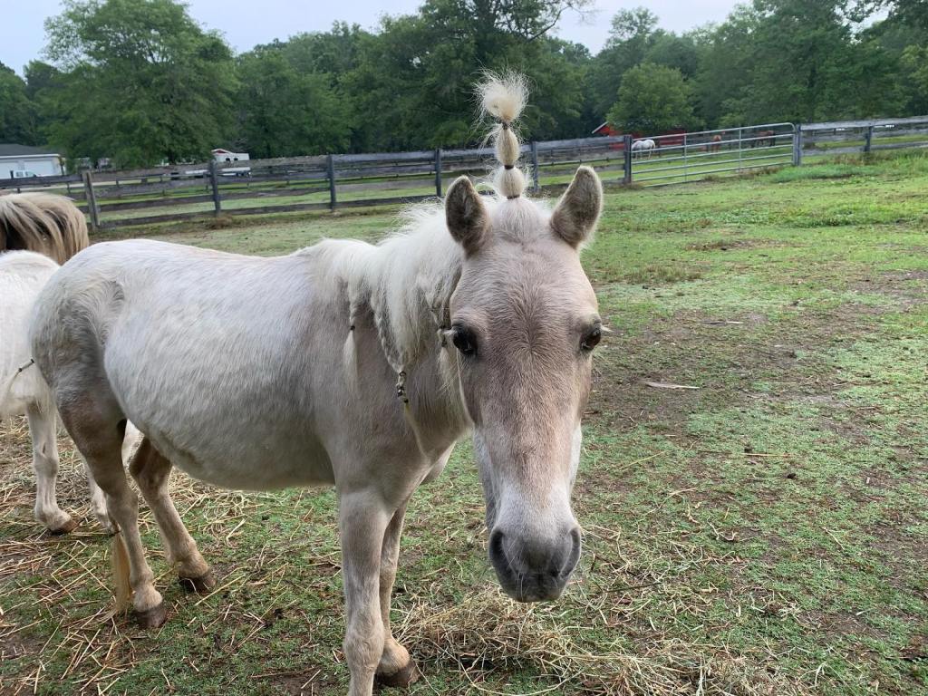 Cinnamon Raisin Toast was adopted by Ms. Renee from L.E.A.R.N Horse Rescue. A surrender case as his owner passed from an incurable disease. Raisin has become the unicorn of the farm. Summer campers love to paint him up in the prettiest colors and turn his forelock into a horn. Although we no longer use him as a riding pony in our riding program, he is still an influential part of lessons. Raisin is the perfect kid size to learn how to catch and lead equines in a safe way. He helps children build their esteem as he willingly allows them to lead him around the farm.
